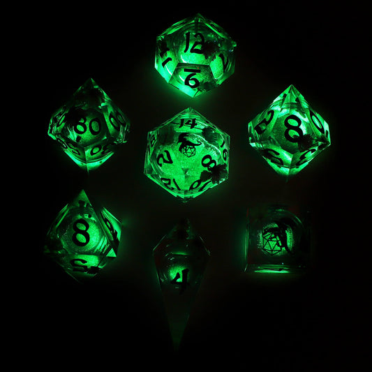 Captured Magic Liquid Core Dice Set - Ethereal Fields, GLOW IN THE DARK Hand Sanded Sharp Edge Resin