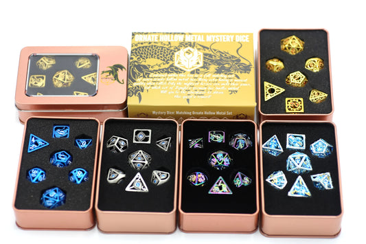 Mystery Set of 7 Matching Ornate Hollow Metal Polyhedral RPG Dice