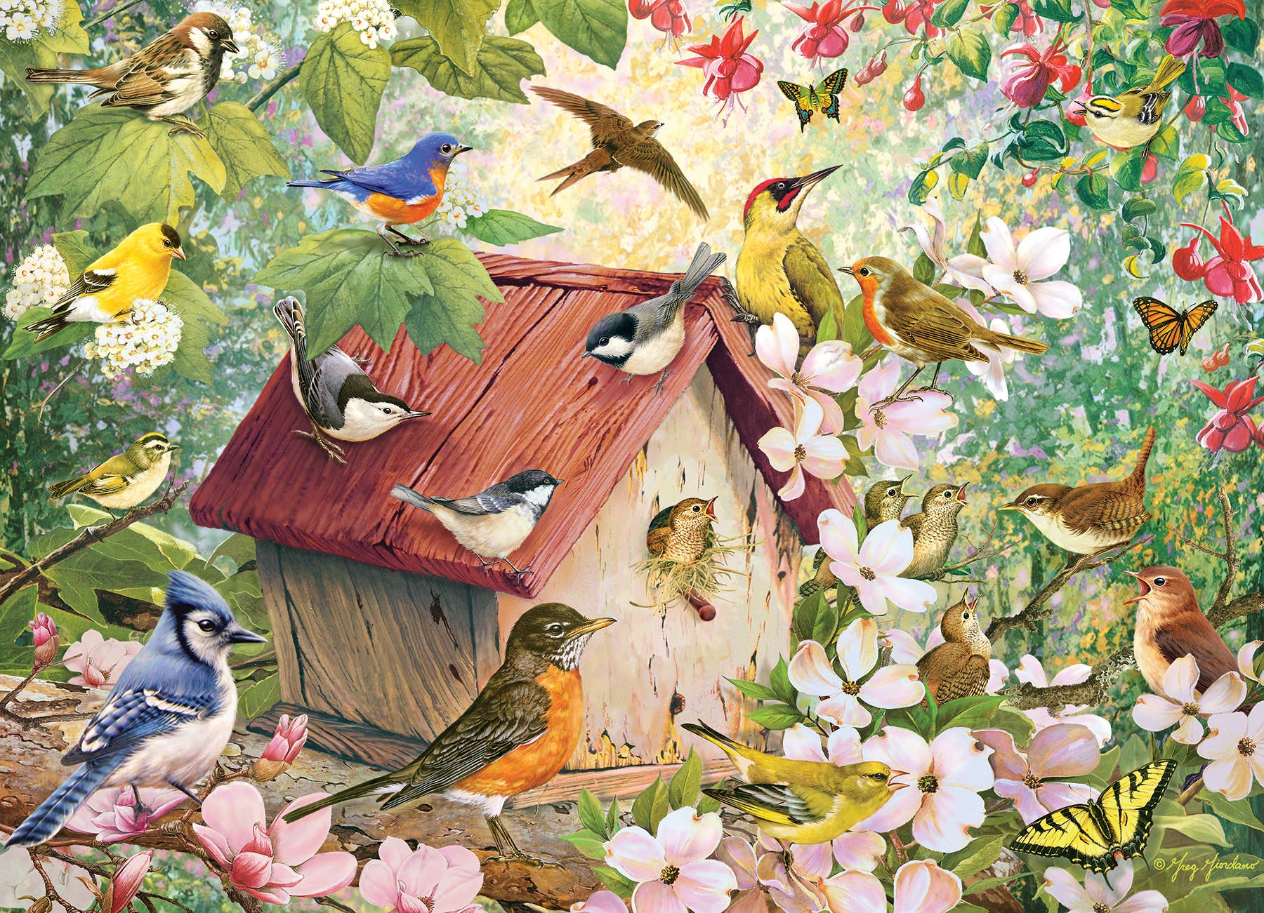 This 1000-piece bird puzzle features robins, blue jays, bluebirds, golden finch, nuthatches, cardinals, and more!