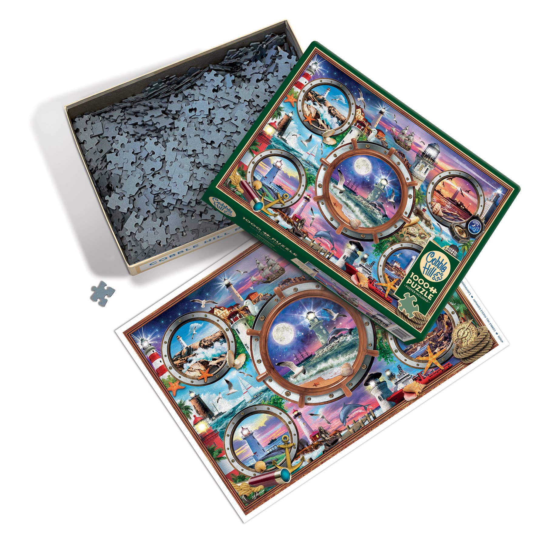 For our ocean lovers, we have Lighthouses, a collage of many beautiful beacons of light. The lighthouses are not just in the portals, but throughout the 1000 piece scenic puzzle with a background full of all things nautical and ocean worthy like sailboats, dolphins, seagulls, and maybe even treasure - if you count the pearl in the oyster! Made in the USA