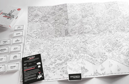Crimes have taken place all over the city, and you want to figure out exactly what's happened, so you'll need to look closely at the giant city map (75 x 110 cm) to find all the hidden information and trace the trails of those who had it in for their foes.