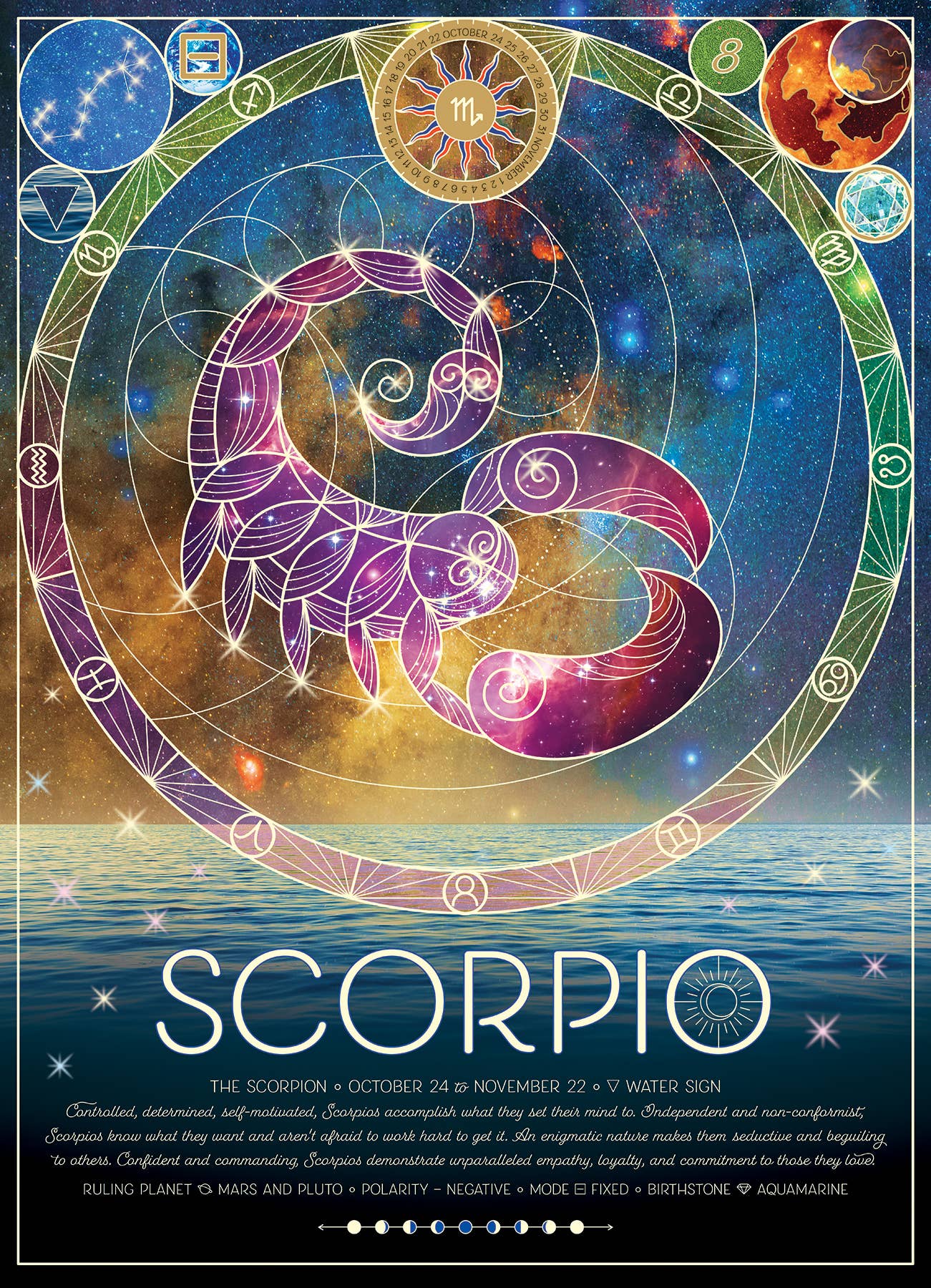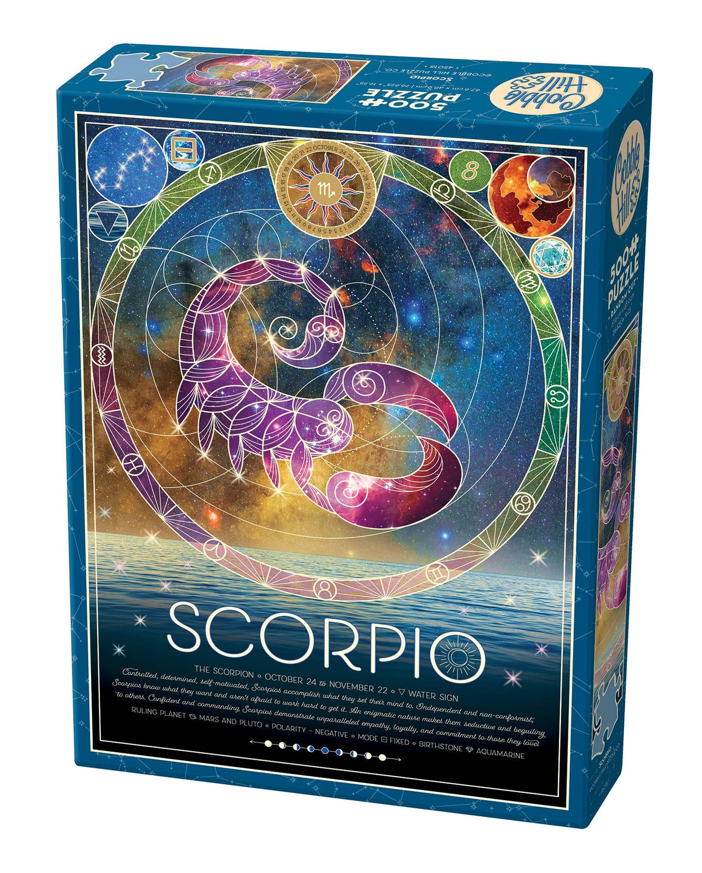 Each 500-piece Zodiac puzzle includes the constellation, symbol, ruling planet, polarity, modes, and stones."